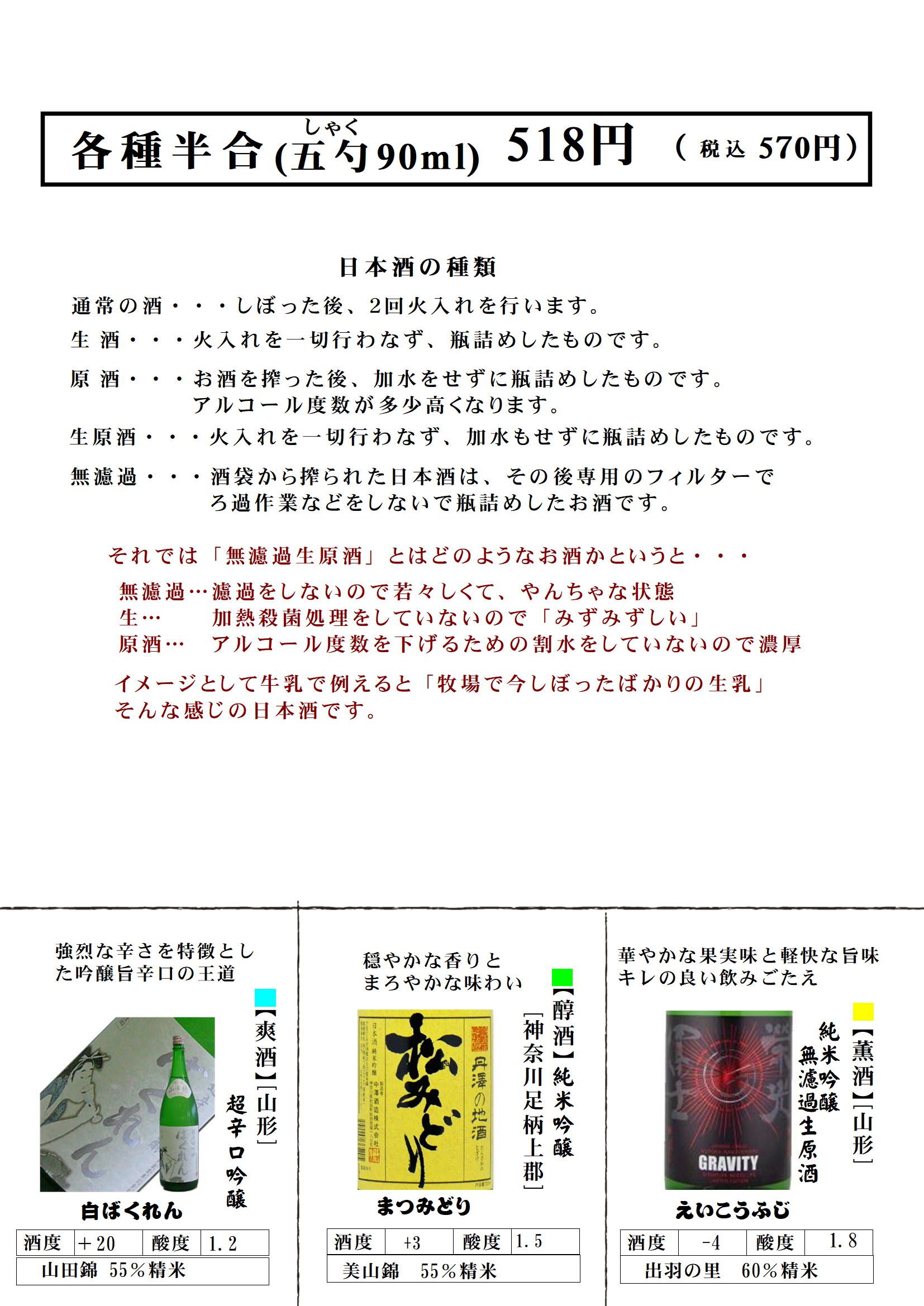 当店の日本酒は5勺(90ml)一律570円となっております。